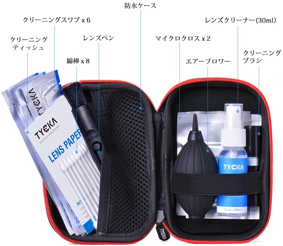 Tycka 9点セット カメラクリーニングキット Tycka 9点セット カメラクリーニングキット【★30mlクリーナー&★6枚センサースワブ】 メンテナンス&清掃用品 カメラクリーナーキット 防水袋付き DSLR レンズおよび電子機器用 TK005 カメラやレンズをメンテナンスするクリーニングキットです。カメラがあれば、クリーニングキットは必須ですね。 購入時期は2018年8月14日、価格は\1890でした。現在(2022年4月現在)も同じモノをアマゾンで購入出来ますが、少し高くなっています。 他にもこんなのがあります。 戻る